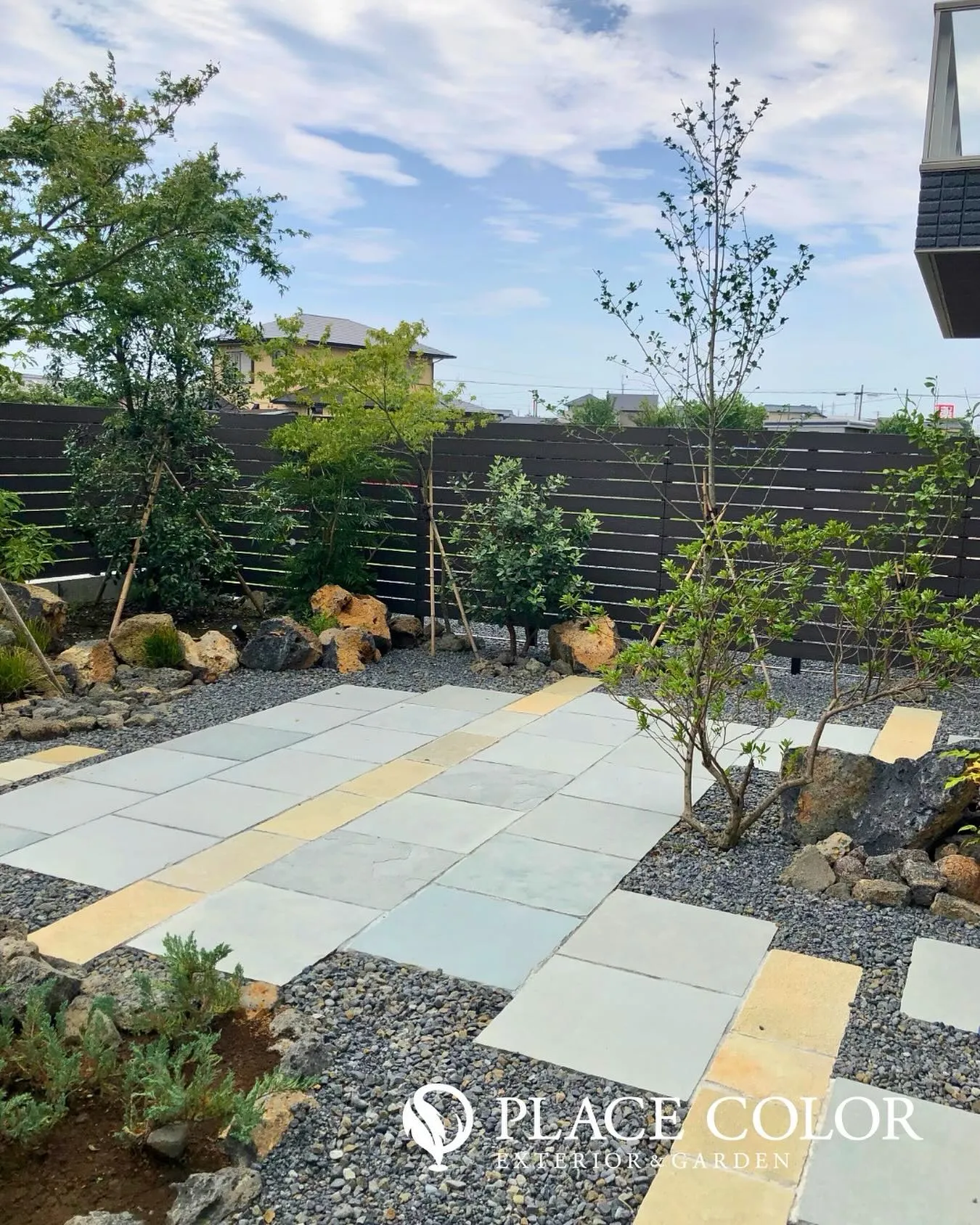 明るい石貼りと自然石の組み合わせが、心地よい動線と奥行きを演出。植栽の高さや配置にもこだわり、どこから見ても美しい眺めに。木調フェンスが空間を引き締め、落ち着きのある和モダン庭園が完成しました。