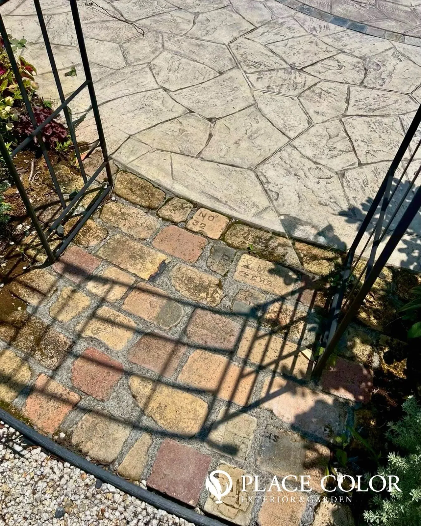 A thoughtful blend of brick and stone paving brings rich texture and visual rhythm to the space. The interplay of iron framing and soft plant shadows creates depth and quiet movement.