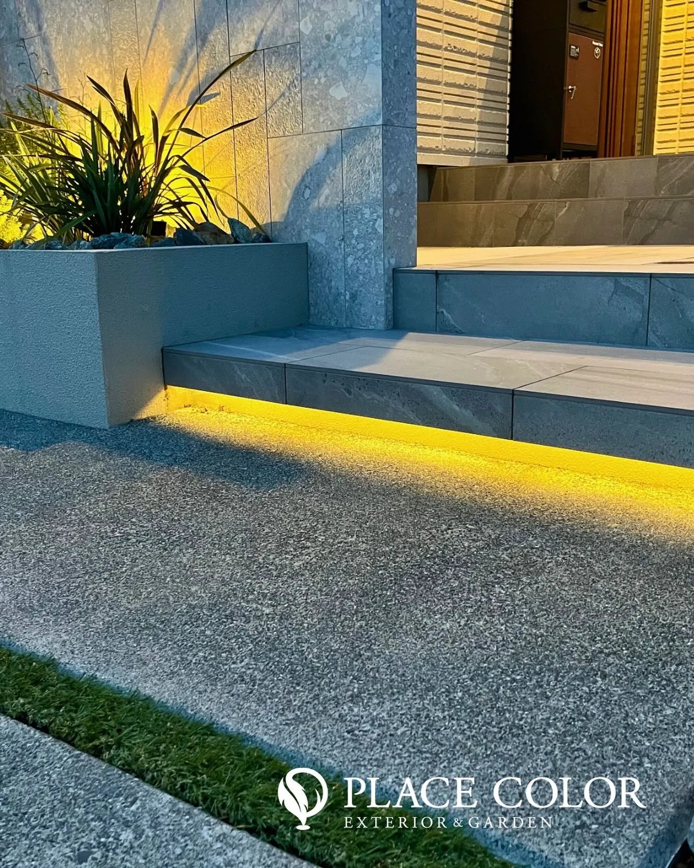 光に浮かぶフローティングステップ✨ 光に浮かぶフローティングステップ✨宙に浮くようなステップと、足元を照らす間接照明が印象的な玄関アプローチ。グレーのタイルと植栽がモダンに調和し、昼夜で異なる表情を楽しめます。FloatingEntrance…