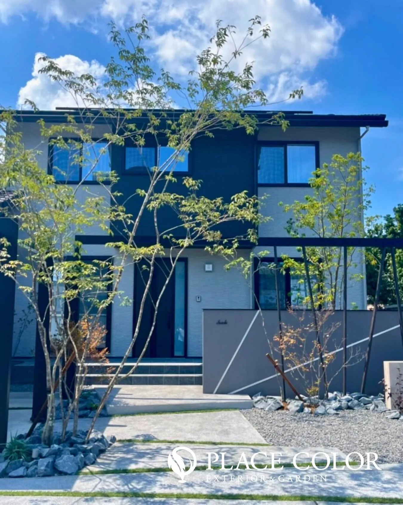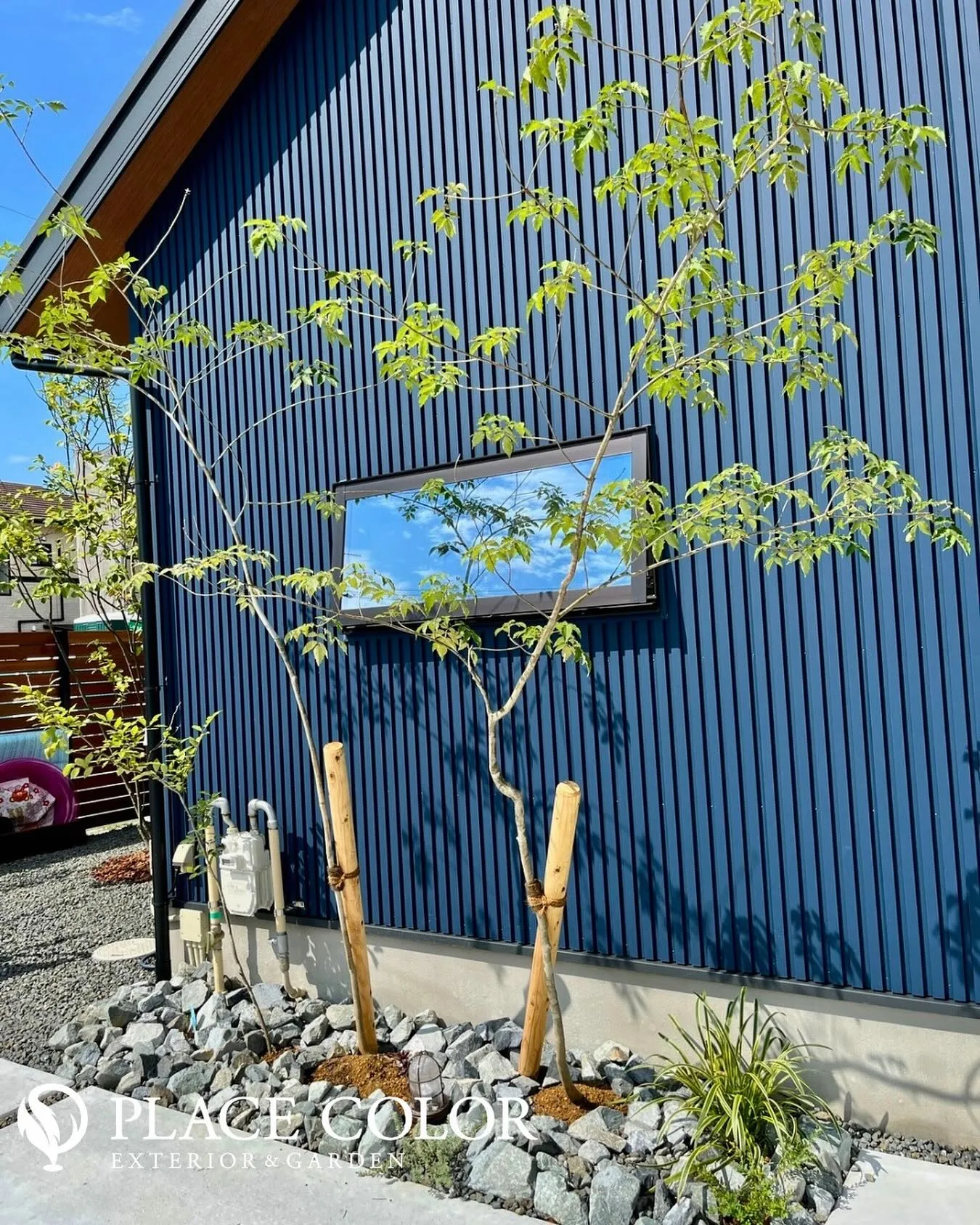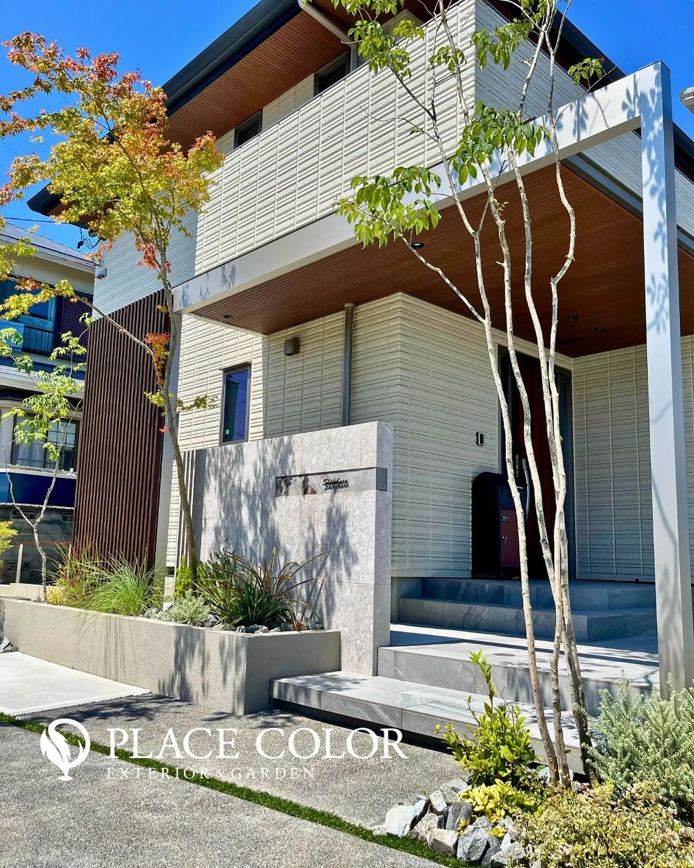 縦ラインが美しい外壁に、繊細な枝ぶりの樹木をコーディネート🌿... 縦ラインが美しい外壁に、繊細な枝ぶりの樹木をコーディネート🌿自然素材の支柱や石でやさしさを添え、ナチュラルモダンな印象に。季節の移ろいが楽しめる癒しの植栽スペースです。VerticalEleganceinHarm…