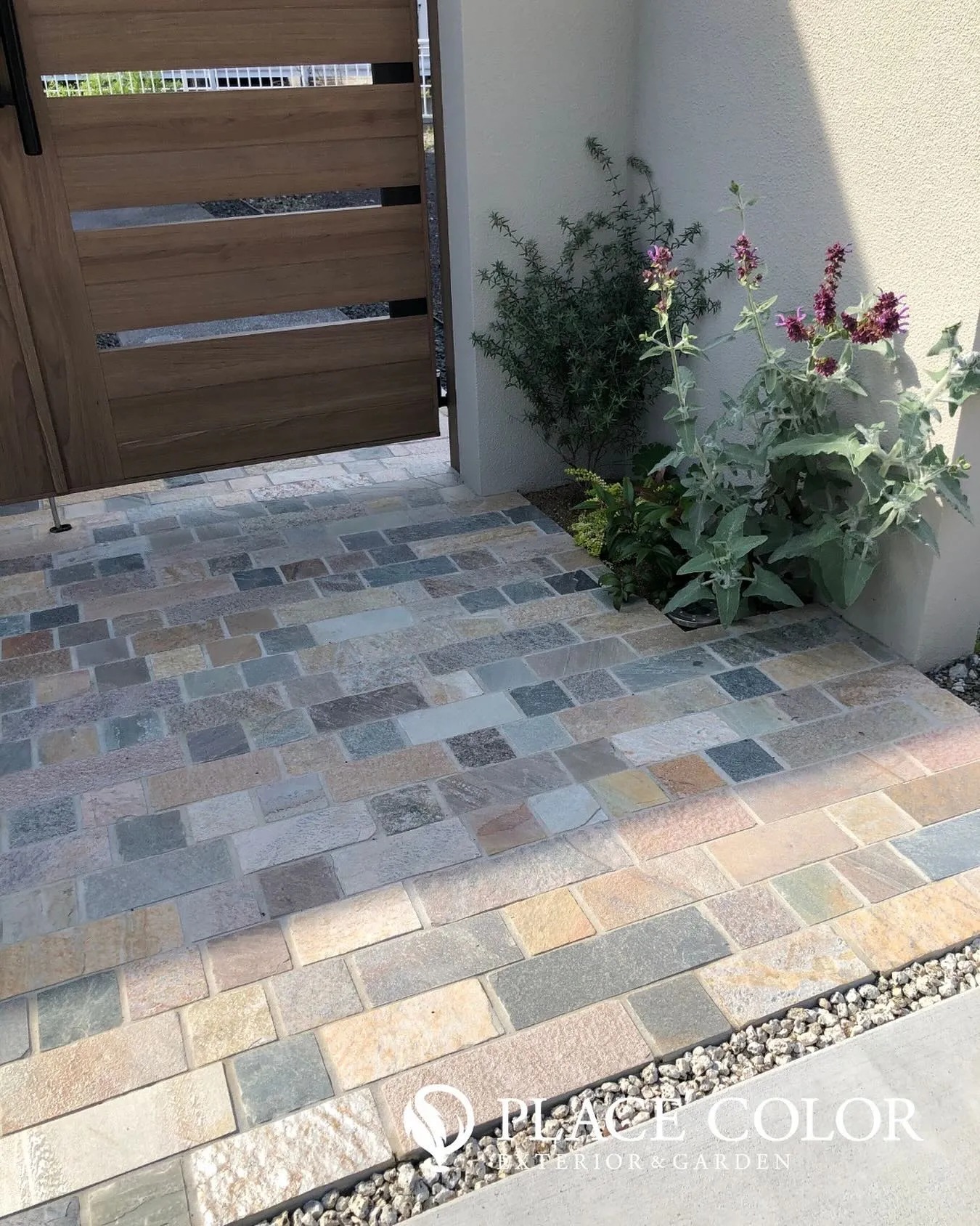 カラフルな石張りアプローチが魅力の門まわり🌿 カラフルな石張りアプローチが魅力の門まわり🌿自然な色合いの石材が、来客を明るく迎える温かみのある空間を演出。ナチュラルな木調門扉と植栽のやさしい緑が調和し、心地よい第一印象を生み出します。We…