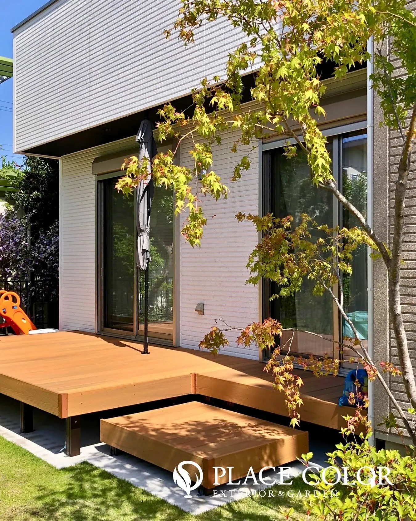 ナチュラルなウッドデッキのある庭🌿 ナチュラルなウッドデッキのある庭🌿ウッドデッキが室内と庭をやさしくつなぎ、自然と一体になれる憩いの空間に。モミジの緑が季節の移ろいを彩り、家族でくつろげるアウトドアリビングが完成しました。Wo…