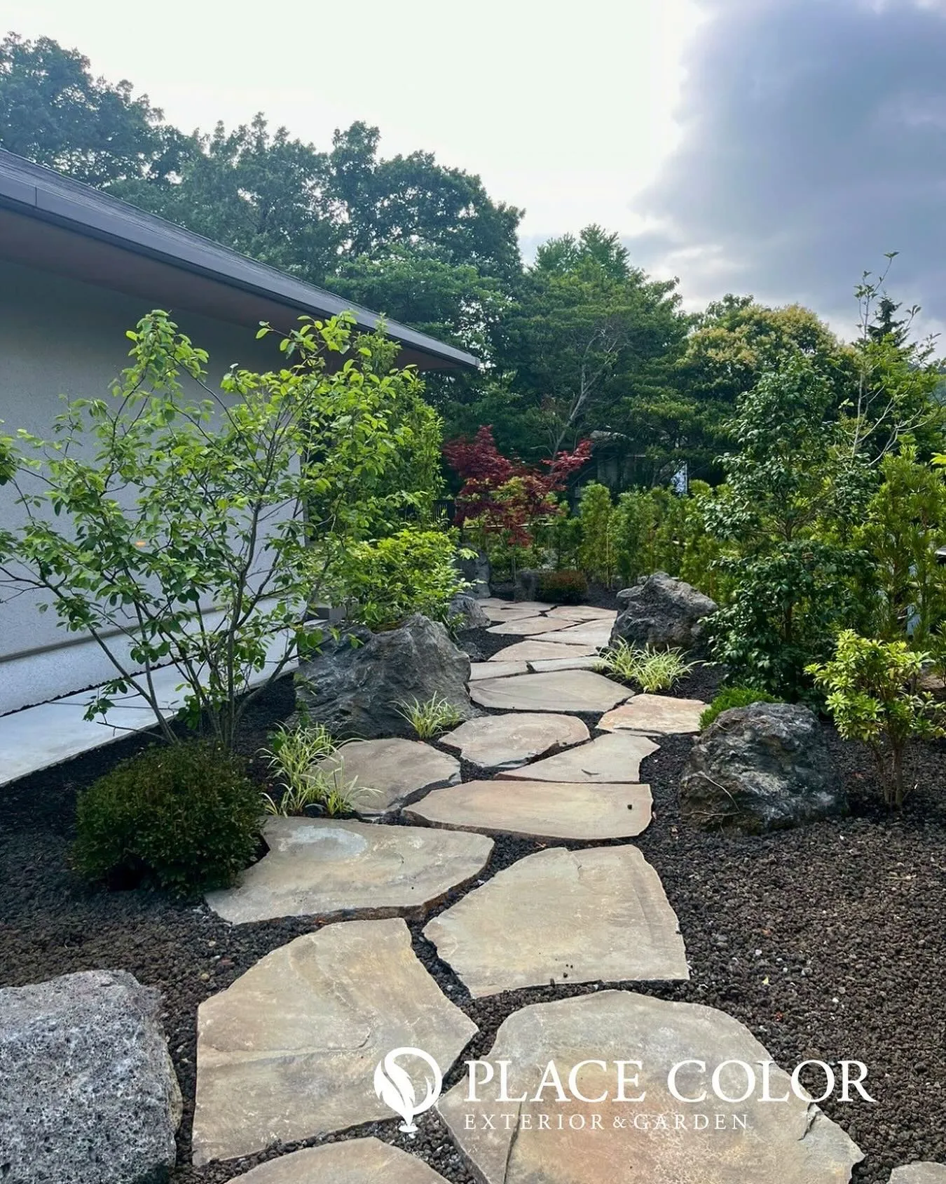 石畳の小径で彩る和の庭🌿 石畳の小径で彩る和の庭🌿自然石をランダムに並べた小径が、奥へと誘う心地よい動線をつくり出します。周囲には四季を彩る植栽を配置し、緑と石が調和する落ち着いた空間に。歩を進めるごとに景色が変わる…