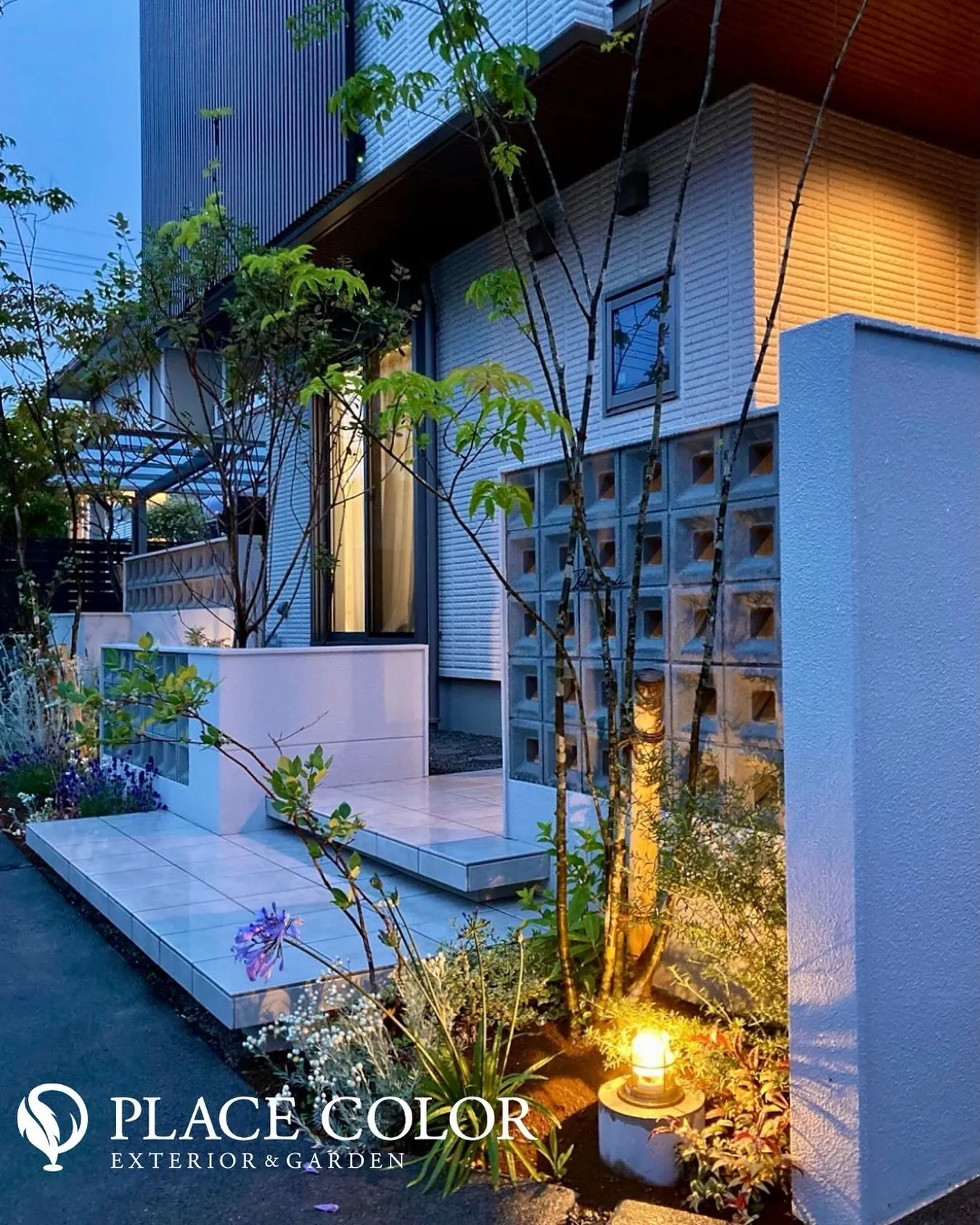 光と緑に包まれたファサード🌿 光と緑に包まれたファサード🌿白を基調としたアプローチに、柔らかな灯りと植栽が彩りを添えるデザイン。ブロックのスクリーンで視線を和らげつつ、開放感も両立。夜も美しい印象的な玄関まわりに仕上がり…