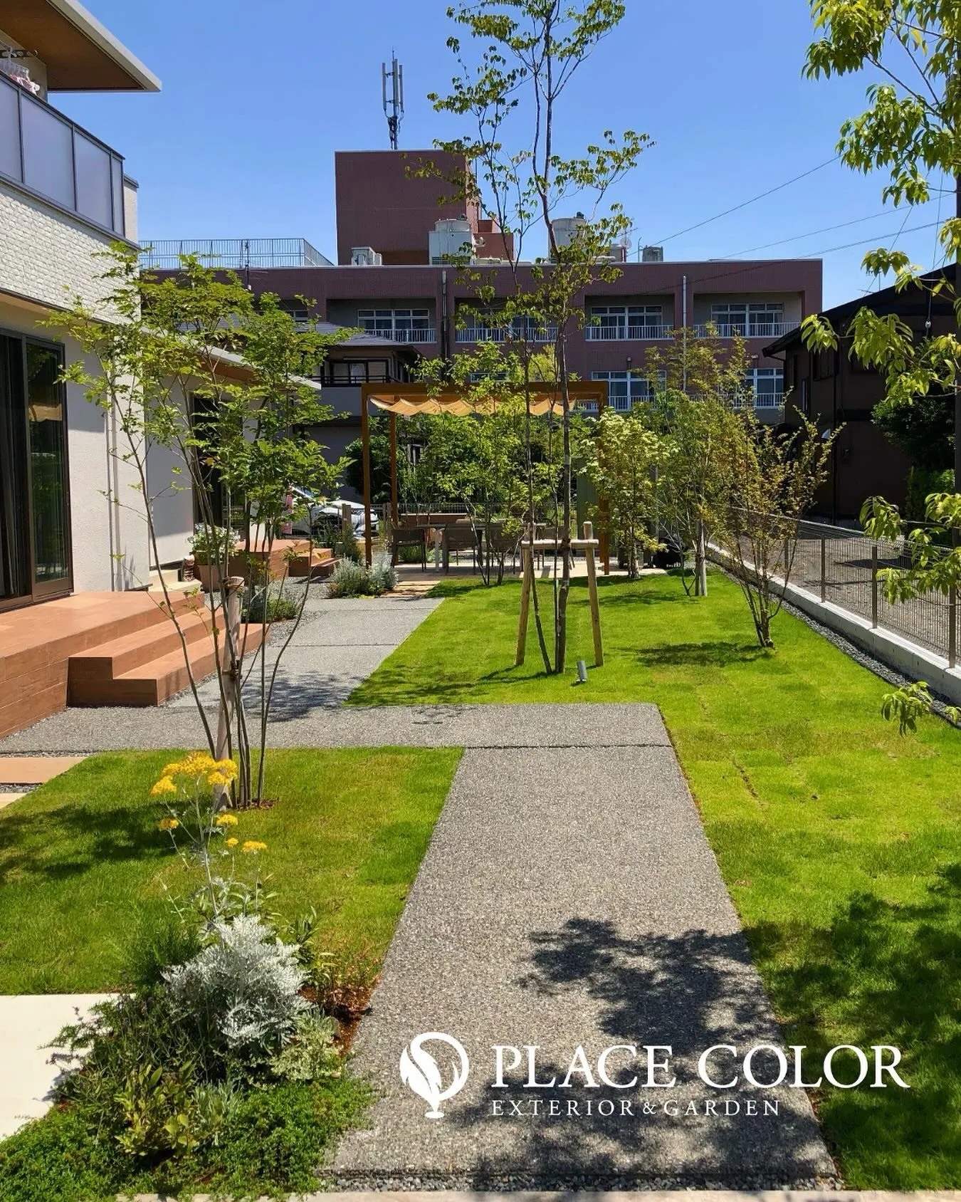緑に癒されるナチュラルガーデン🌿 緑に癒されるナチュラルガーデン🌿直線的なアプローチが空間を引き締め、樹木や芝が心地よい広がりを演出。木製デッキとパーゴラがくつろぎの場を生み出します。TranquilNaturalGarden🌿Alinearpathwaylend…