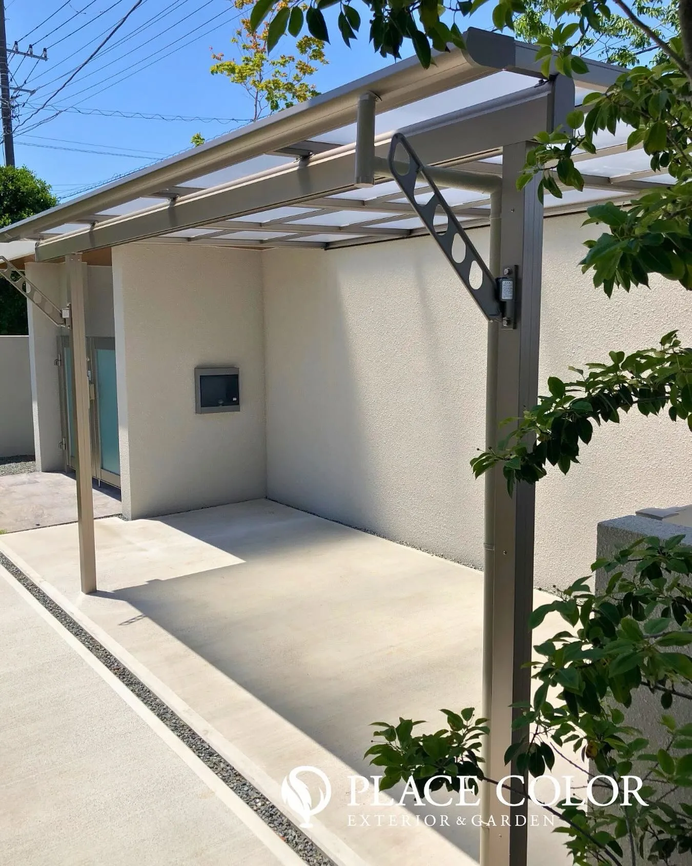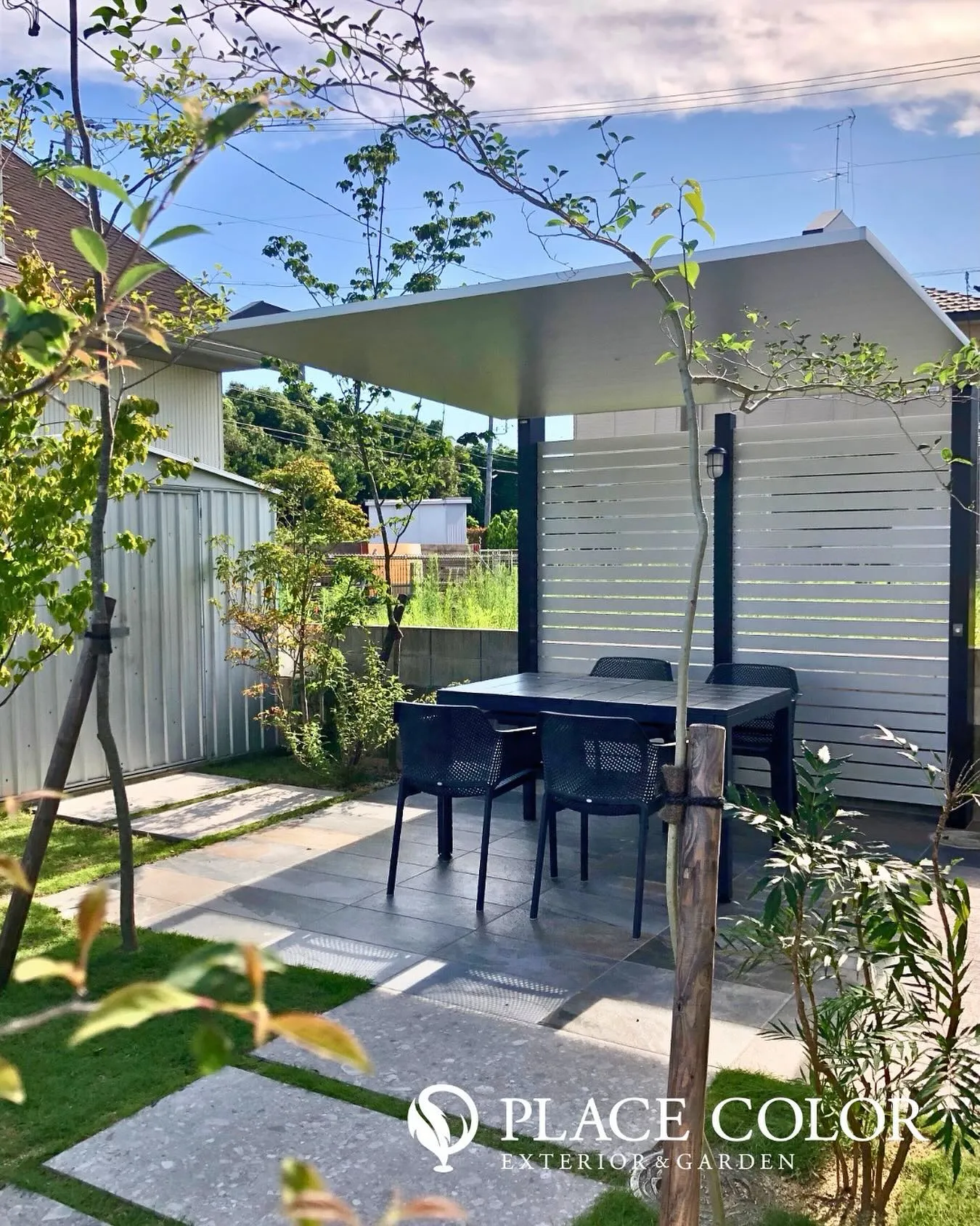 白いルーバーと屋根が印象的なガーデンテラス🌿 白いルーバーと屋根が印象的なガーデンテラス🌿黒の家具で引き締めた空間は、木漏れ日が心地よく通り抜けるくつろぎの場に。芝とタイルのコントラストも爽やかで、自然と調和した上質なひとときを演出しま…
