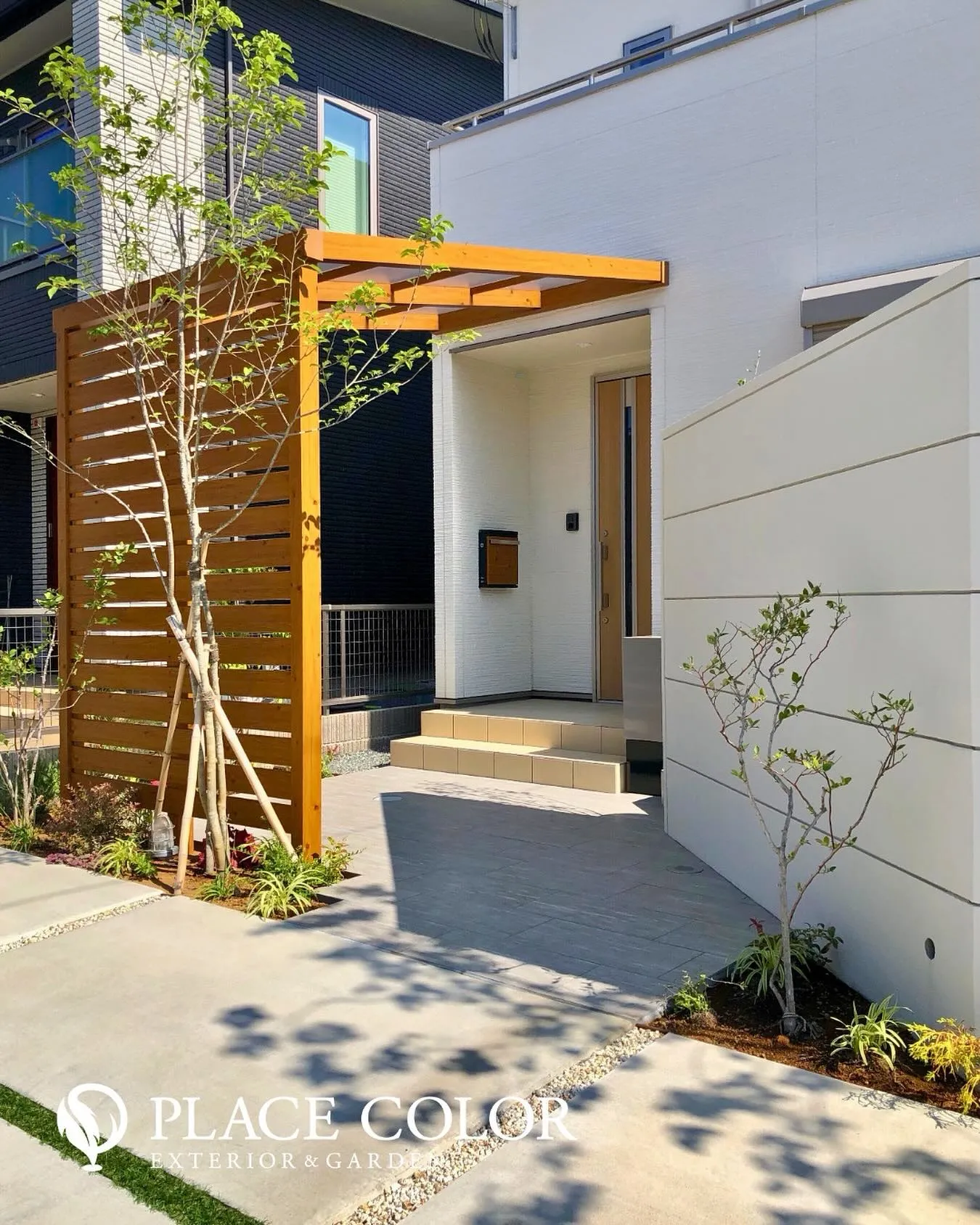 木調フレームで彩るナチュラルモダンな門まわり🌿 木調フレームで彩るナチュラルモダンな門まわり🌿温かみのある木調スクリーンと屋根フレームが印象的な玄関アプローチ。白壁やタイルの質感と調和し、開放感とプライバシーを両立。植栽の緑がやさしく迎え…