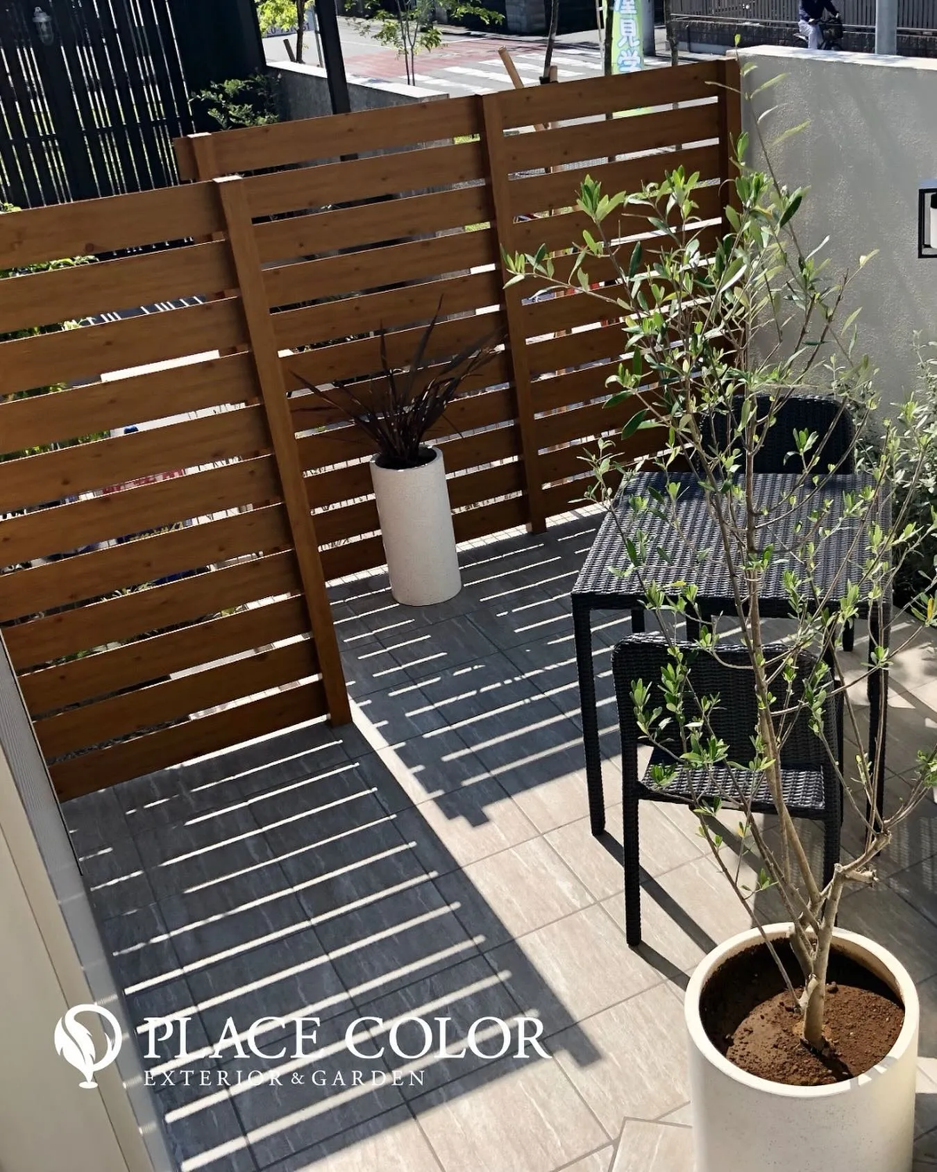 プライベートテラス🌿 プライベートテラス🌿木調フェンスで囲まれた空間に、タイル敷きのテラスとシックな家具を配置。自然光が美しい影を落とし、植栽が優しく彩る、心安らぐひとときの場所です。PrivateTerraceRetreat🌿Aseren…